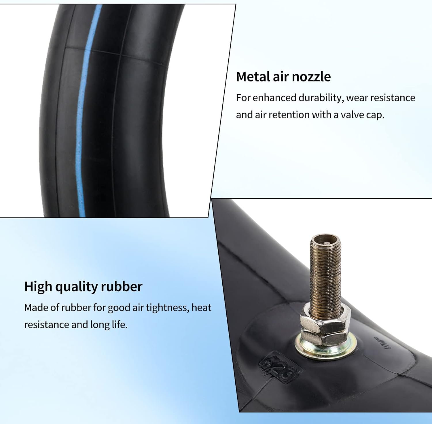 2. La cámara de aire se ha sometido a un riguroso control del 100 % y con este juego de cámaras de aire todoterreno estará preparado para cualquier posible reventón. El efecto de amortiguación de impactos garantiza que los golpes y las abolladuras no sean un gran problema tanto si conduce dentro como fuera de la carretera.